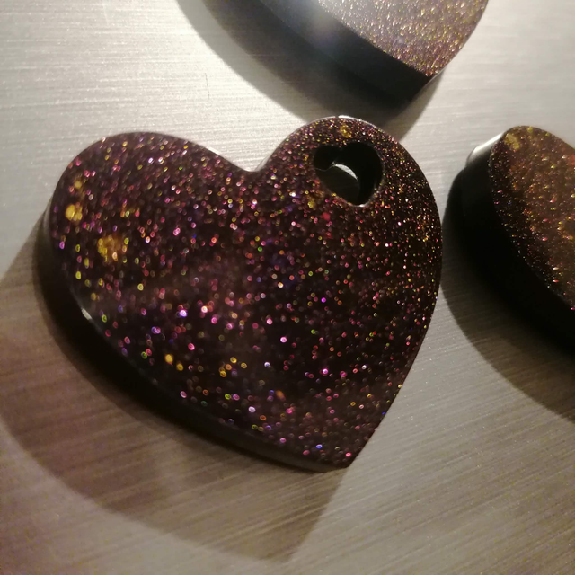 Laissez-vous séduire par ce lot d’aimants en forme de cœur, réalisés entièrement à la main en résine époxy. Leur teinte profonde, parsemée de paillettes et reflets multicolores, crée un effet galaxie raffiné et captivant.